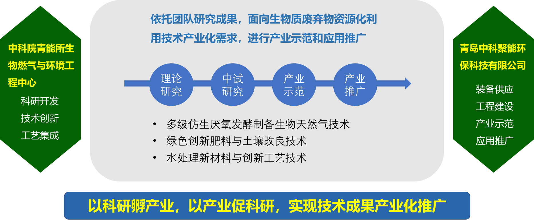 青岛中科聚能环保科技有限公司(以下简称“中科聚能”)成立于2016年7月12日,是生物燃气与环境工程中心孵化的技术成果推广公司,以中国科学院青岛生物能源与过程研究所(以下简称“研究所”)原创性成果为依托,为客户提供高生产效益、低投资、低运行成本的先进技术和装备,致力于成为我国有机固废资源化利用的全产业链服务商。