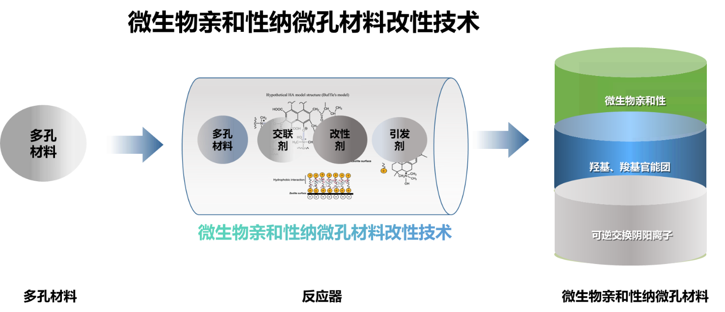 针对土壤理化性状差、养分利用率低、功能微生物定殖难、土壤微生态失衡等问题,开展人工/天然多孔材料活化、表面固相接枝与功能化修饰研究,开发微生物亲和型多孔功能材料制备技术,构建了纳米-微米级孔道结构材料,实现改性材料的羟基、羧基等活性官能团富集与可逆阴阳离子交换,从而实现了养分可控缓释、微生物定殖与生长显著促进、土壤理化性状有效改良、土壤微生态系统全面优化。