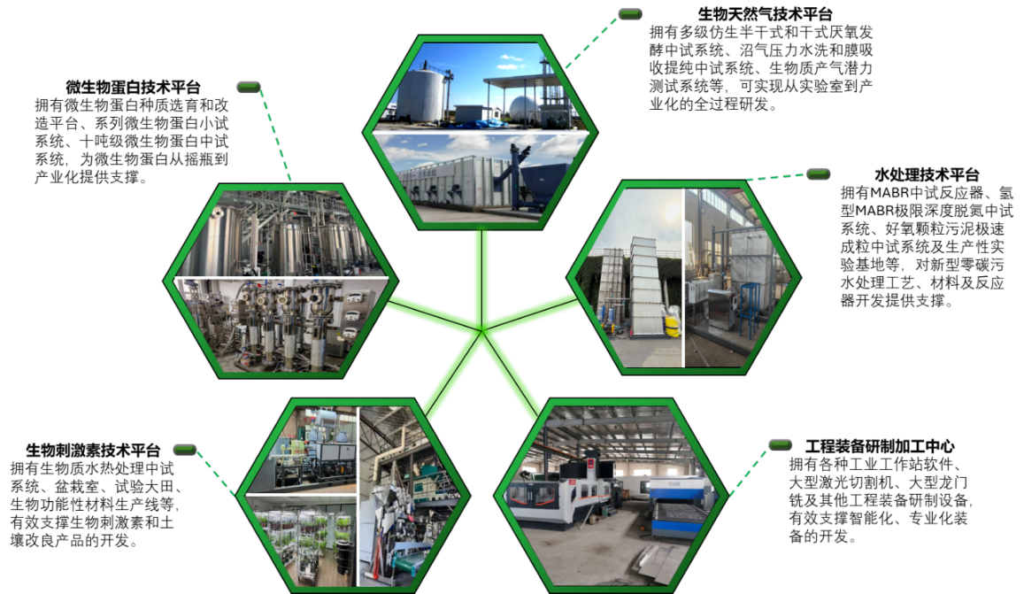 中心在研究所新源路园区现有约500平米实验室平台,拥有价值2000余万元的各类高端及常规实验及分析仪器,有效支撑中心各研究方向的基础研究,以及拥有数十套厌氧发酵、污水处理、单细胞蛋白、水热处理等方向的小试设备。在研究所的平度中试基地,中心还拥有500m3发酵容积的厌氧发酵与沼气净化中试研发系统、500m3发酵容积的多级仿生干式厌氧发酵中试系统、十吨级单细胞蛋白中试研发系统、生物质水热处理中试系统、污水处理膜材料中试研发系统以及生物刺激素中试生产线及试验田等中试平台。通过生物天然气产业化项目的推广,中心与项目企业合作,在山东无棣县、黑龙江克山县等地还建设了产业化研究基地,同时中心还在青岛即墨建立了产业化设备研制加工中心,为中心的产业化技术与装备的开发提供有力支撑。