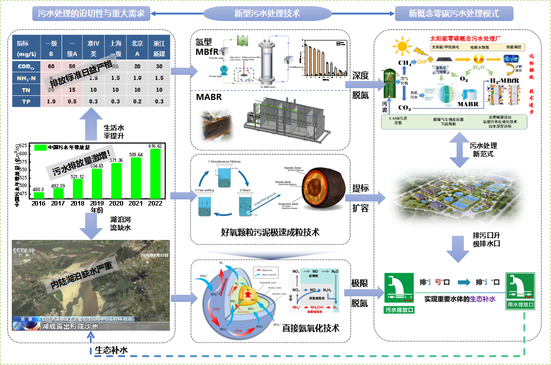 面向污水处理技术中对节能降碳的重大需求,针对好氧颗粒污泥成粒慢、MABR传质效率低、厌氧氨氧化启动难等问题,团队开发了好氧颗粒污泥极速成粒技术、MABR零碳水处理技术、直接氨氧化定向诱导技术等系列创新性技术。这些技术突破了传统生物处理技术的瓶颈,为实现污水处理高效稳定运行和资源化利用提供了新路径。
