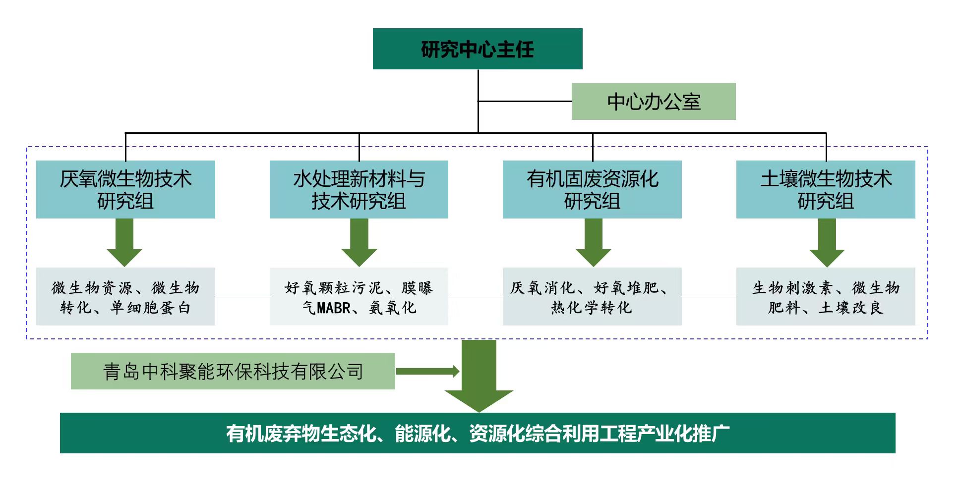 生物燃气与环境工程中心是研究所核心组群之一,承担了中国科学院在生物天然气领域唯一的省部级研发平台-生物天然气山东省工程研究中心。主要从事农业、城市有机废弃物制备生物天然气技术研究、装备开发和产业化推广,同时拓展出了污水治理新材料、工业尾气及其他一碳气体制备微生物蛋白等研究方向。先后承担中国科学院重大突破项目“秸秆基百万立方生物天然气产业化系统”、中国科学院科技成果转移转化重点专项“分布式农业生物质沼气规模化生产与利用产业化”、中国科学院战略性先导科技专项A类课题“城镇化区域生物天然气综合利用与分布式供能工业化示范”及其他国家重点研发计划、973课题、863课题、重大装备研制等项目100余项。开发的生物天然气产业链技术与装备体系2016年即经院士领衔的专家组鉴定为技术水平“国内领先、国际先进”,中心的技术创新和产业化推广在业内产生了重要影响,最新开发的多级仿生厌氧发酵技术引领行业技术更新换代。